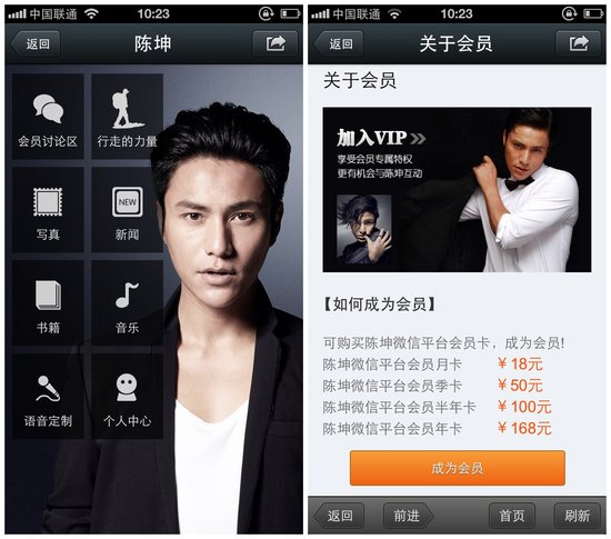微信公眾賬號的新一輪玩法即將掀起。昨晚,娛樂明星陳坤的官方微信賬號吸引了眾人的注意。該賬號通過接入微信支付實現(xiàn)的會員功能,讓微信公眾平臺的增值服務(wù)價值被更多人所認(rèn)識。